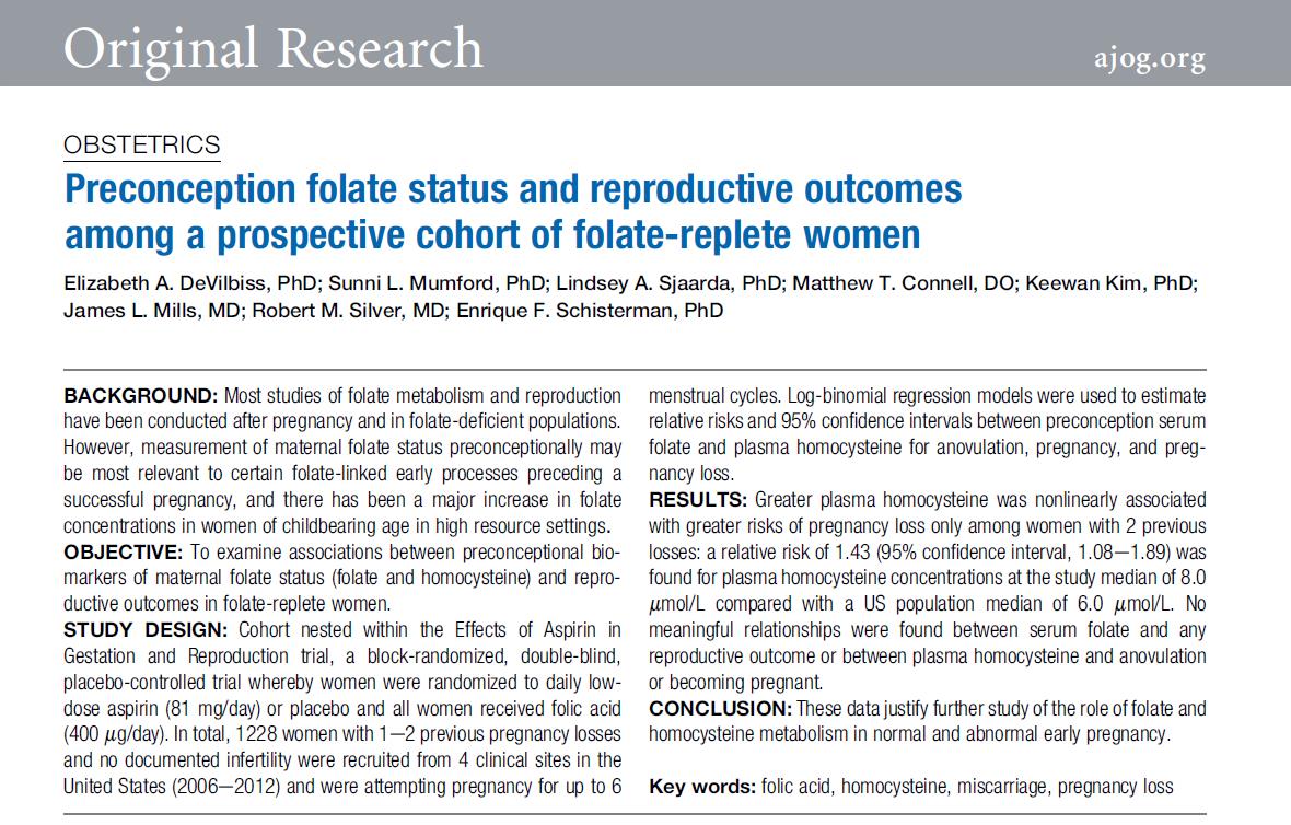 1. Mumford SL, et al. Preconception folate status and reproductive outcomes among a prospective cohort of folate-replete women. Am J Obstet Gynecol. 2019;220(4):399.e1-399.e10.