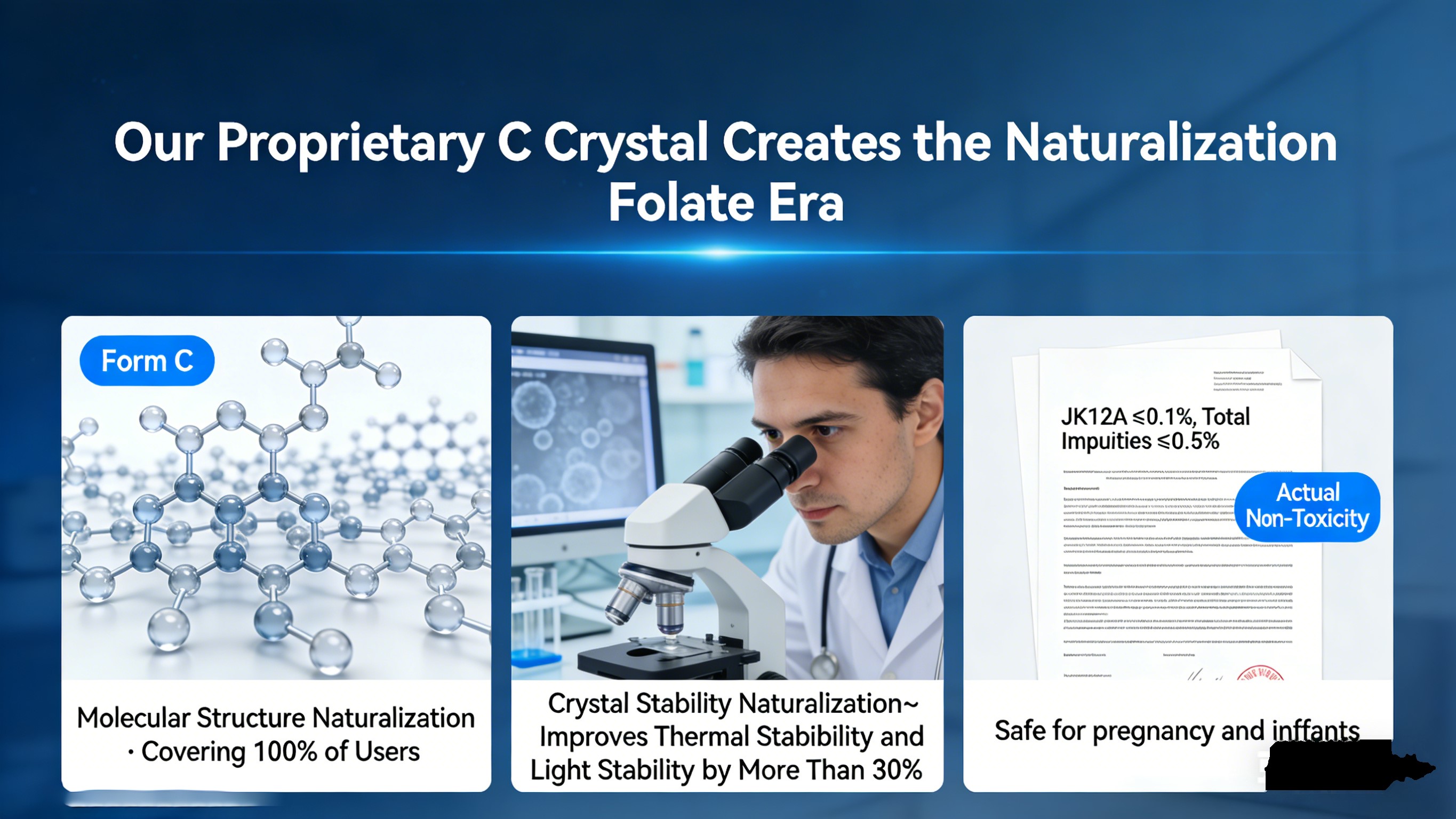 Based on our C-crystal patent, we pioneered the “Naturalization folate” category, earning the first global certification. True Naturalization folate requires meeting three core criteria, clearly distinguishing it from generic I-crystal active folate: