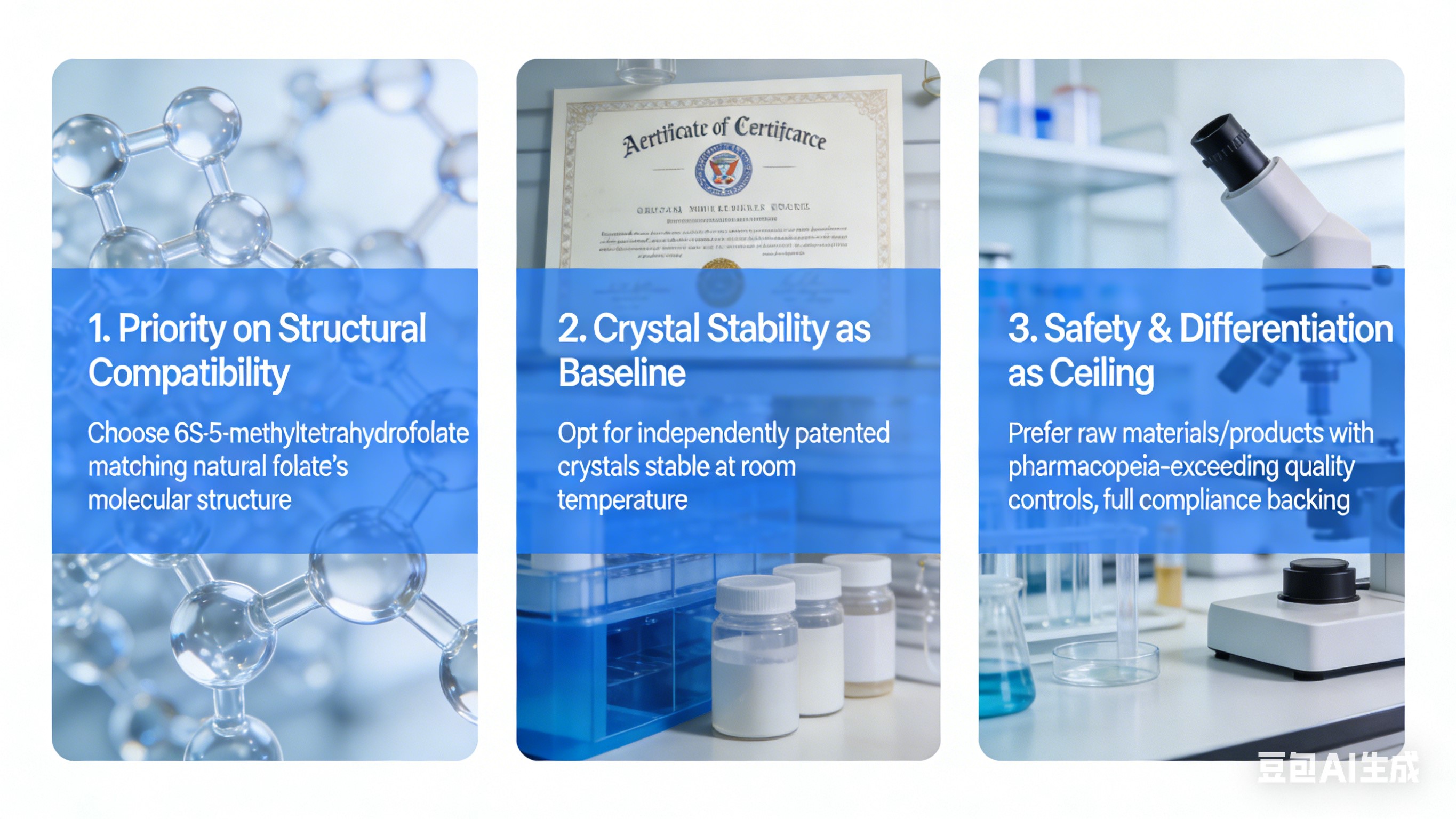 1. Priority on Structural Compatibility: Choose 6S-5-methyltetrahydrofolate matching natural folate’s molecular structure — direct absorption, covers all users, prevents inefficacy.2. Crystal Stability as Baseline: Opt for independently patented crystals stable at room temperature to ensure batch consistency and label claim compliance.